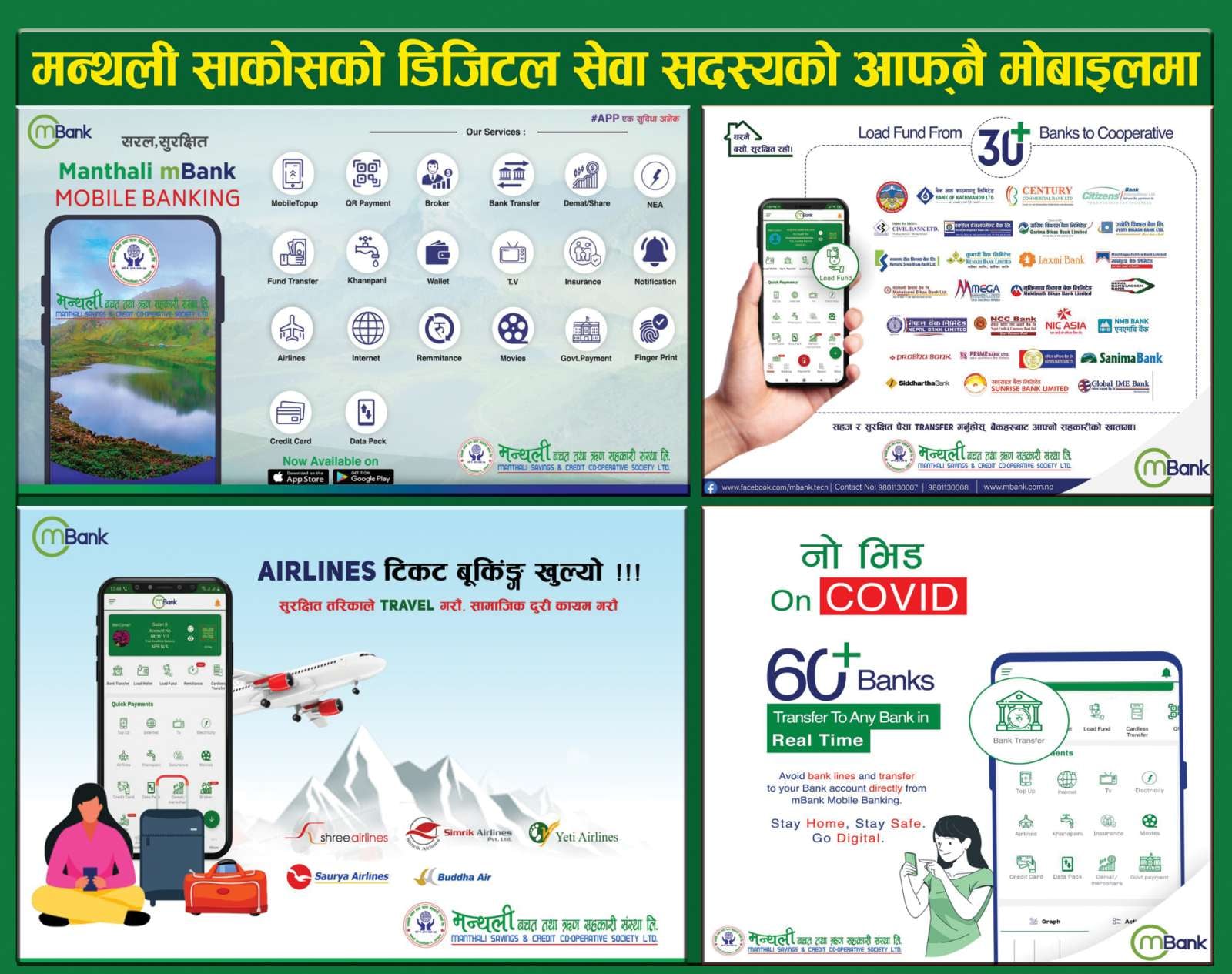 मन्थली सहकारी संस्थाका सदस्यकालागि आधुनिक डिजिटल मोबाइल बैंकिङ सेवा उपलब्ध छ । मोबाइल बैङिक एप्स्को प्रयोगबाट सदस्यहरुले आफ्नो एच्छिक खाताको कारोवार विवरण हेर्न सकिनेछ । साथै सोही खाताबाट विभिन्न अनलाइन भुक्तानी तथा कारोवार समेत गर्न सकिनेछ ।